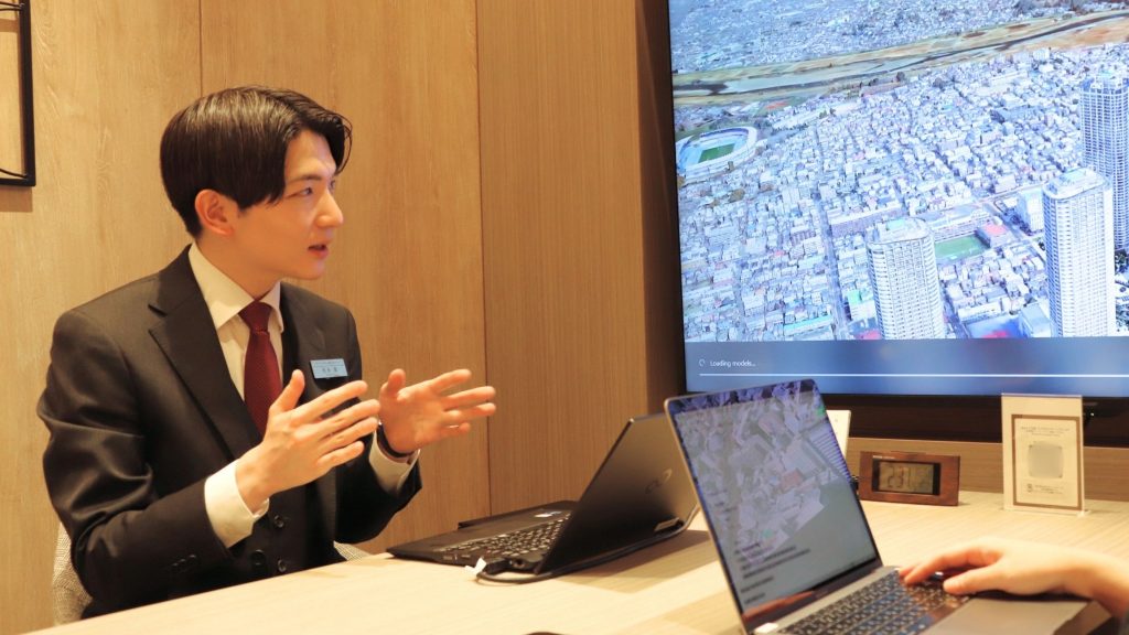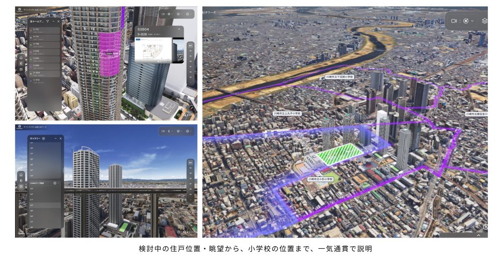 板倉様:検討中のお部屋の位置を立体的に示したり、階層ごとの眺望をご体験いただけたりするだけでなく、既存タワーとの位置関係や小学校の位置など、街全体の文脈もあわせて説明できます。マクロ(街・周辺)からミクロ(住戸)な情報まで、このツールひとつで一気通貫に伝えられる点が非常に説明しやすいですね。
