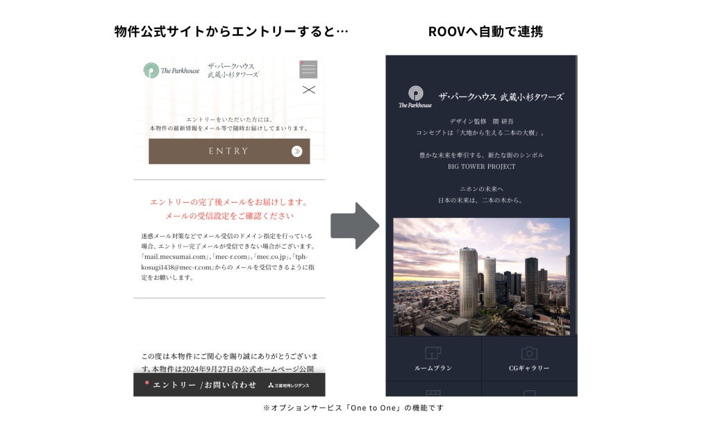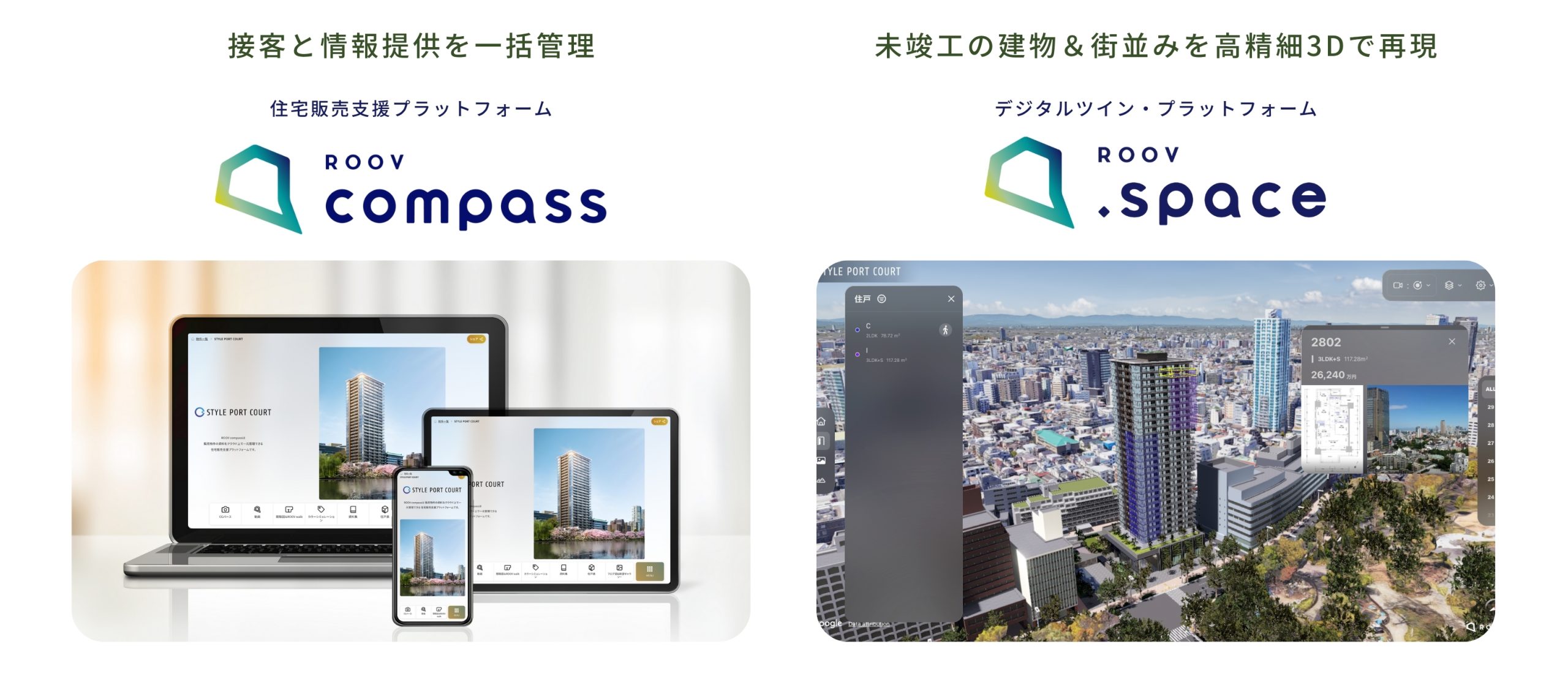 本物件では、接客と情報提供を一括管理できる住宅販売支援プラットフォーム「ROOV compass」と、未竣工の建物&街並みを高精細3Dで再現するデジタルツイン・プラットフォーム「ROOV.space」を組み合わせることで、これらの課題を解決しました。