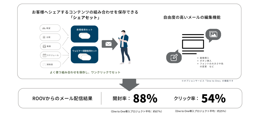 板倉様:お客様の関心が高いうちにご覧いただけるよう、来場後のメールはスピーディーに送ることを徹底しました。お客様へシェア(共有)するコンテンツの組み合わせを保存できる「シェアセット」機能を活用することで、負担なくルーティン化できたと思います。メール作成時は画像を挿入し、「何が更新されたのか」を視覚的に示す工夫も効果的でした。