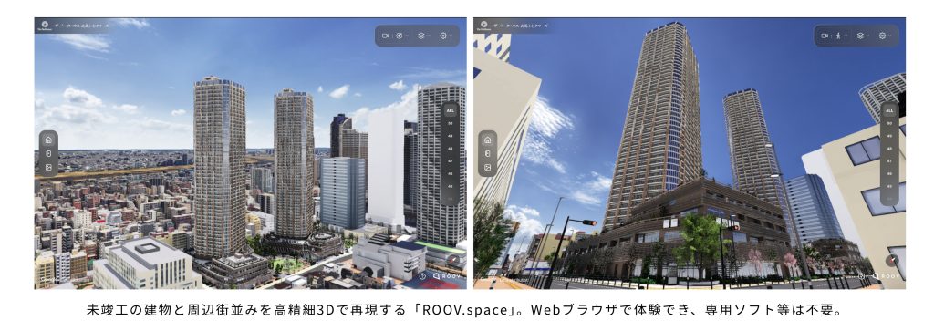 本物件では、接客と情報提供を一括管理できる住宅販売支援プラットフォーム「ROOV compass」と、未竣工の建物&街並みを高精細3Dで再現するデジタルツイン・プラットフォーム「ROOV.space」を組み合わせることで、これらの課題を解決しました。